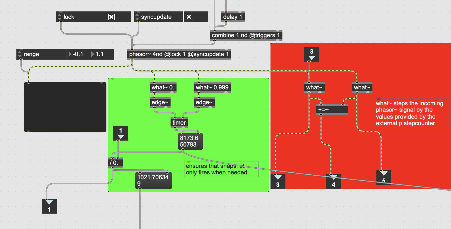 These modules use a Phasor~ object to keep time as they are sample-accurate. The What~ objects in the red box create block-like stepped signals when the phasor crosses a predefined threshold. A few extra calculations later and these signals have been scaled and converted into pitch data for the oscillators in the synth modules. The green box times the milliseconds between the start and end of each Phasor~ cycle. This timed value only became necessary when the BPM data was added later on and started to change parameters such as tempo. Without the exact time between step sequencer cycles, digital artefacts created by parameters changing mid-playback were destroying the overall audio quality.